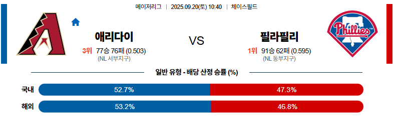 애리조나 대 필라델피아 MLB 09월20일 맞대결 생중계, 스포츠중계, 스포츠분석