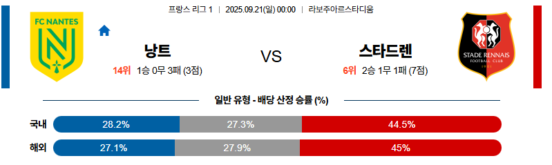낭트 대 스타드렌 리그앙 09월21일 맞대결 생중계, 스포츠중계, 스포츠분석