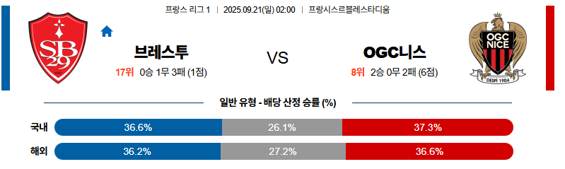 브레스트는 공격 템포는 날카롭지만, 수비 간격이 벌어지는 순간 급격히 무너지는 불안 요소를 안고 있습니다. 니스는 부다위의 침투와 보가의 돌파, 케빈 카를로스의 제공권을 결합해 다채로운 공격 패턴을 구축합니다. 브레스트가 수비 간격을 좁히지 못할 경우, 니스의 전환 속도와 압박에 쉽게 휘말릴 가능성이 큽니다. 게다가 니스는 원정에서도 흔들림 없는 조직력과 후반 집중력을 보여, 경기 전체의 리듬을 가져올 수 있습니다. 결국 이 경기는 브레스트의 구조적 약점을 니스가 파고들어 승부를 가를 가능성이 높습니다. 공격 효율성과 수비 안정성에서 차이를 보이는 만큼, 니스의 우세한 흐름을 예상할 수 있습니다.