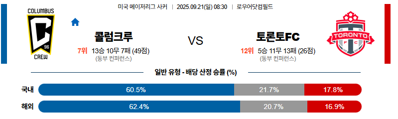 콜럼버스 대 토론토 메이저리그사커 09월21일 맞대결 생중계, 스포츠중계, 스포츠분석