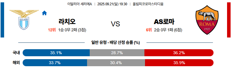 라치오 대 AS로마 세리에A 09월21일 맞대결 생중계, 스포츠중계, 스포츠분석