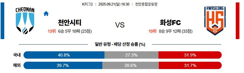 이번 경기는 화성이 직선적인 전진 패턴과 전환 속도를 무기로 경기 주도권을 가져갈 흐름입니다. 심리적으로도 원정의 부담보다 전술적 자신감이 더 크게 작용할 수 있어, 화성이 승부를 끊어낼 확률이 높습니다.