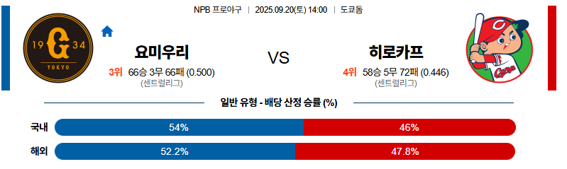 요미우리 대 히로시마 NPB 09월20일 맞대결 생중계, 스포츠중계, 스포츠분석
