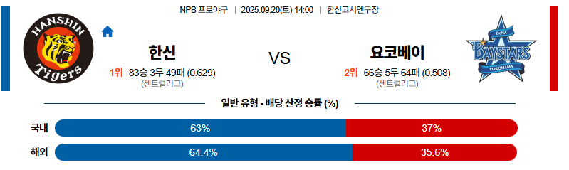 한신 대 요코하마 NPB 09월20일 맞대결 생중계, 스포츠중계, 스포츠분석