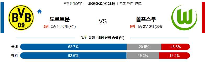 도르트문트 대 볼프스부르크 분데스리가 09월22일 맞대결 생중계, 스포츠중계, 스포츠분석
