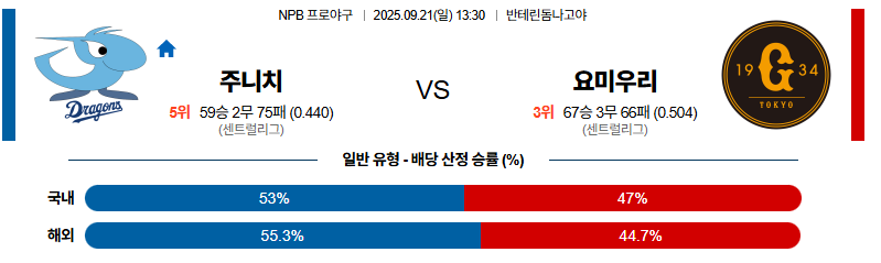 주니치 대 요미우리 NPB 09월21일 맞대결 생중계, 스포츠중계, 스포츠분석