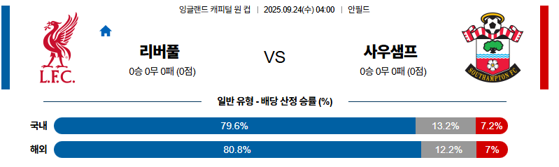 리버풀 대 사우스햄튼 잉글랜드캐피털원컵 09월24일 맞대결 생중계, 스포츠중계, 스포츠분석
