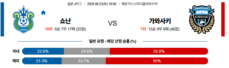 쇼난벨마레 대 가와사키 J리그1 09월23일 맞대결 생중계, 스포츠중계, 스포츠분석