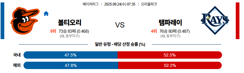 볼티모어 대 탬파베이 MLB 09월24일 맞대결 생중계, 스포츠중계, 스포츠분석