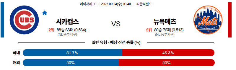 시카고컵스 대 뉴욕메츠 MLB 09월24일 맞대결 생중계, 스포츠중계, 스포츠분석