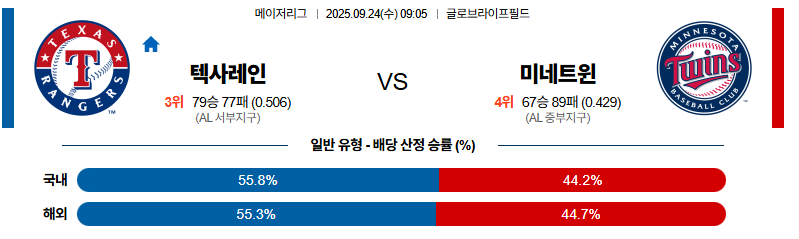 텍사스 대 미네소타 MLB 09월24일 맞대결 생중계, 스포츠중계, 스포츠분석
