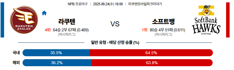 라쿠텐 대 소프트뱅크 NPB 09월24일 맞대결 생중계, 스포츠중계, 스포츠분석