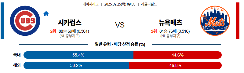 시카고컵스 대 뉴욕메츠 MLB 09월25일 맞대결 생중계, 스포츠중계, 스포츠분석