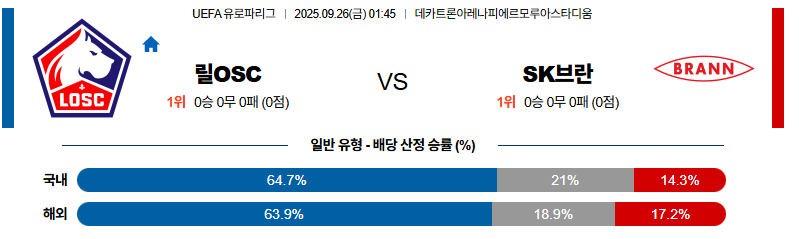 릴 대 브란 UEFA유로파리그 09월26일 맞대결 생중계, 스포츠중계, 스포츠분석