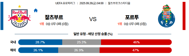 포르투는 오모로디온의 제공권 장악과 베이가의 물오른 기량으로 공격 주도권을 확실히 가져갈 수 있습니다. 잘츠부르크는 빠른 압박으로 균형을 노리겠지만, 공중전과 세컨드 볼에서 불리해 결국 흐름을 내줄 가능성이 높습니다. 이번 경기는 포르투가 전술적 강점을 살려 승리를 확정 지을 무대가 될 것입니다.