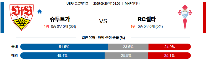 슈투트가르트 대 셀타비고 UEFA유로파리그 09월26일 맞대결 생중계, 스포츠중계, 스포츠분석