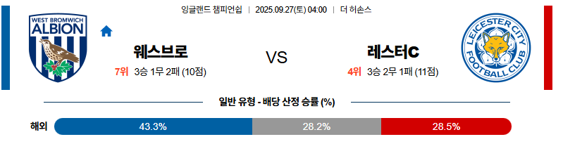 웨스트브로미치 대 레스터시티 잉글랜드챔피언쉽 09월27일 맞대결 생중계, 스포츠중계, 스포츠분석