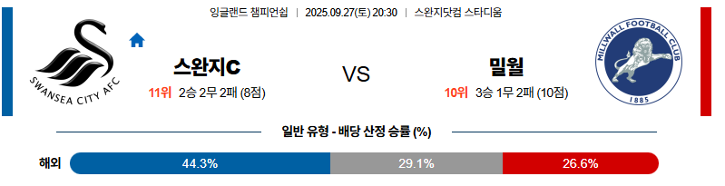 스완지시티 대 밀월 잉글랜드챔피언쉽 09월27일 맞대결 생중계, 스포츠중계, 스포츠분석