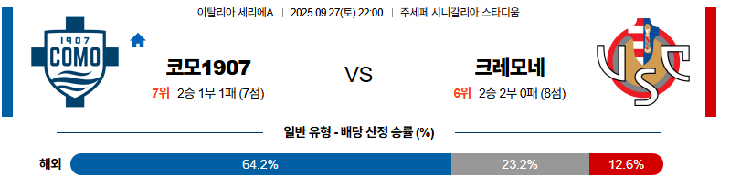 코모 대 크레모네세 세리에A 09월27일 맞대결 생중계, 스포츠중계, 스포츠분석