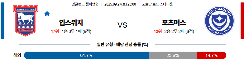 입스위치 대 포츠머스 잉글랜드챔피언쉽 09월27일 맞대결 생중계, 스포츠중계, 스포츠분석