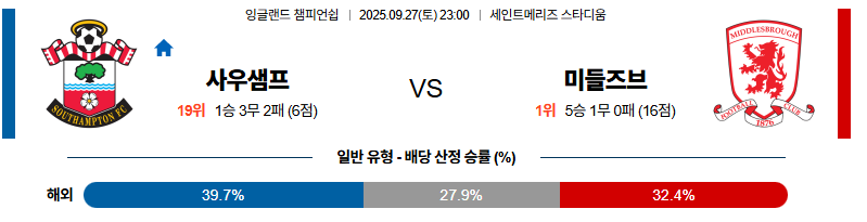 사우스햄튼 대 미들즈브러 잉글랜드챔피언쉽 09월27일 맞대결 생중계, 스포츠중계, 스포츠분석