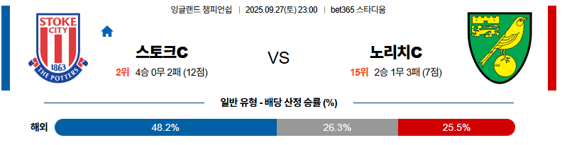 스토크시티 대 노리치시티 잉글랜드챔피언쉽 09월27일 맞대결 생중계, 스포츠중계, 스포츠분석