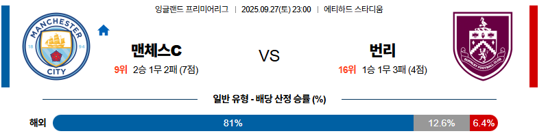 맨시티 대 번리 프리미어리그 09월27일 맞대결 생중계, 스포츠중계, 스포츠분석