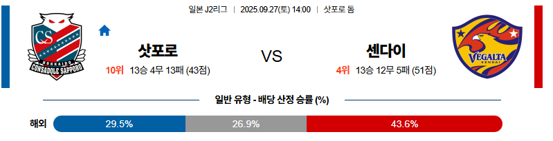 삿포로 대 베갈타센다이 J리그2 09월27일 맞대결 생중계, 스포츠중계, 스포츠분석