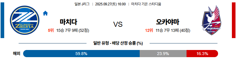마치다는 침투 패턴과 교체 자원 활용에서 뚜렷한 강점을 가지고 있으며, 오카야마는 템포와 체력 관리 문제로 경기 후반 갈수록 불안정합니다. 이번 경기는 마치다가 공간 활용과 경기 운영 면에서 한 수 위의 퍼포먼스를 보여줄 것으로 예상됩니다.