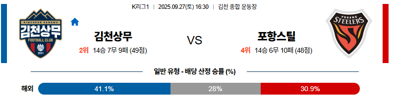 김천은 전술 완성도와 강력한 전방 압박, 그리고 홈 경기에서 발휘되는 특별한 동기부여까지 더해져 매우 단단한 팀입니다. 포항은 전술 전환으로 개선된 부분이 있지만, 응집력과 압박 강도가 높은 김천을 원정에서 제압하기에는 한계가 뚜렷합니다. 이 경기는 조직력과 정신적 에너지를 모두 갖춘 김천이 홈에서 승리를 만들어낼 가능성이 높습니다.