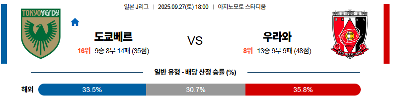도쿄베르디 대 우라와 J리그1 09월27일 맞대결 생중계, 스포츠중계, 스포츠분석