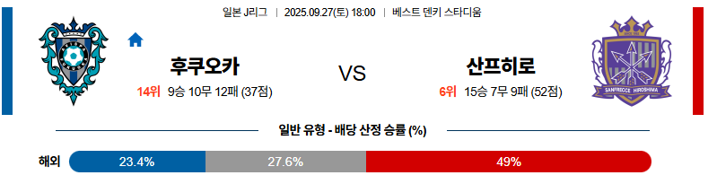 후쿠오카 대 산프레체히로시마 J리그1 09월27일 맞대결 생중계, 스포츠중계, 스포츠분석