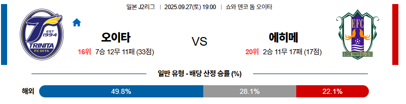 오이타 대 에히메 J리그2 09월27일 맞대결 생중계, 스포츠중계, 스포츠분석
