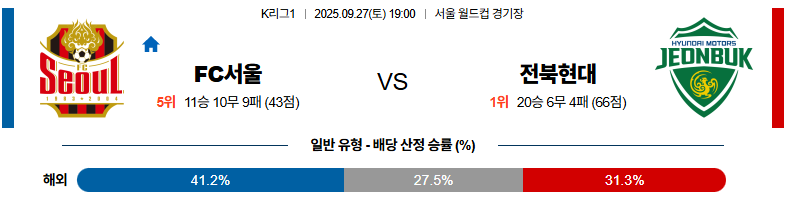 무승부가 가장 유력해 보이며, 핸디는 패, 언더를 추천드립니다. FC서울은 둑스의 부재와 야잔의 불확실성으로 인해 안정적 운영에 초점을 맞출 것이며, 전북 역시 심리적 긴장감 저하로 공격적으로 나설 이유가 적습니다.