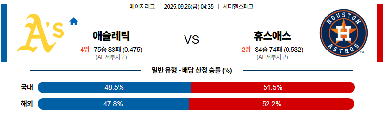 애슬레틱스 대 휴스턴 MLB 09월26일 맞대결 생중계, 스포츠중계, 스포츠분석