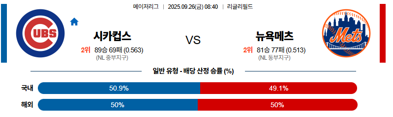 시카고컵스 대 뉴욕메츠 MLB 09월26일 맞대결 생중계, 스포츠중계, 스포츠분석