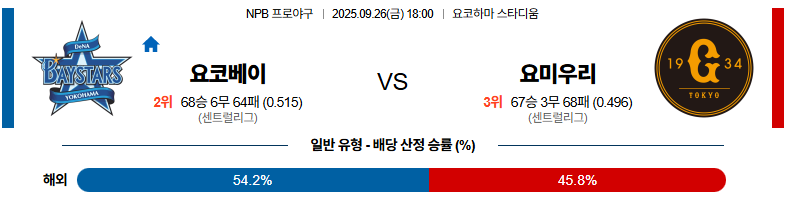 요코하마 대 요미우리 NPB 09월26일 맞대결 생중계, 스포츠중계, 스포츠분석