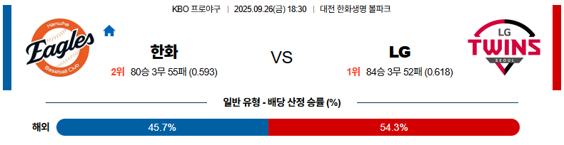 한화 대 LG KBO 09월26일 맞대결 생중계, 스포츠중계, 스포츠분석