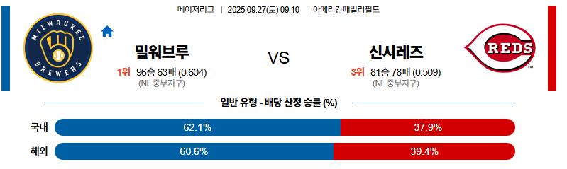 밀워키 대 신시내티 MLB 09월27일 맞대결 생중계, 스포츠중계, 스포츠분석