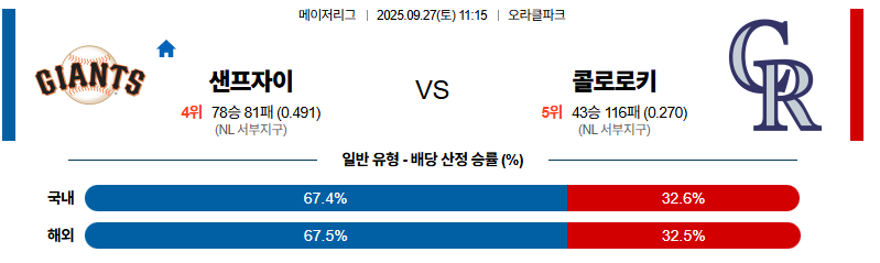 샌프란시스코 대 콜로라도 MLB 09월27일 맞대결 생중계, 스포츠중계, 스포츠분석