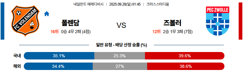 폴렌담 대 즈볼레 에레디비지 09월28일 맞대결 생중계, 스포츠중계, 스포츠분석