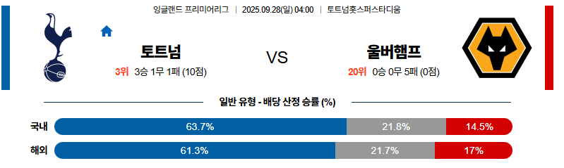 이번 매치업은 토트넘이 홈에서 공격 전개를 주도하며 확실히 우위를 점할 수 있는 구도입니다.
