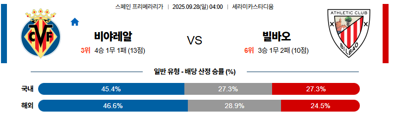이 경기는 비야레알의 포백이 이냐키 윌리엄스의 폭발적인 뒷공간 침투를 얼마나 잘 제어하느냐에 달려 있습니다. 비야레알이 홈에서 점유를 늘리려 하더라도, 빌바오의 스피드와 세트피스 퀄리티는 단 한 번의 기회로도 승부를 뒤집을 수 있는 힘이 있습니다.
