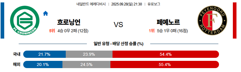 흐로닝언 대 폐예노르트 에레디비지 09월28일 맞대결 생중계, 스포츠중계, 스포츠분석