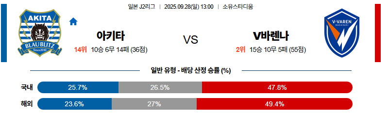 아키타 대 나가사키 J리그2 09월28일 맞대결 생중계, 스포츠중계, 스포츠분석