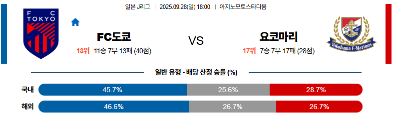 FC도쿄 대 요코하마마리노스 J리그1 09월28일 맞대결 생중계, 스포츠중계, 스포츠분석