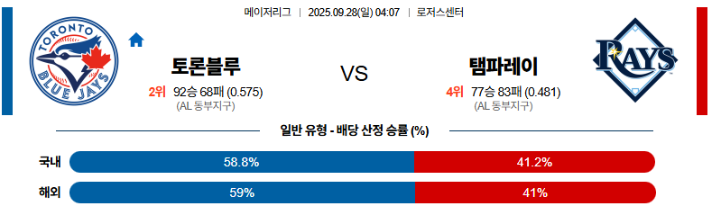 토론토 대 탬파베이 MLB 09월28일 맞대결 생중계, 스포츠중계, 스포츠분석