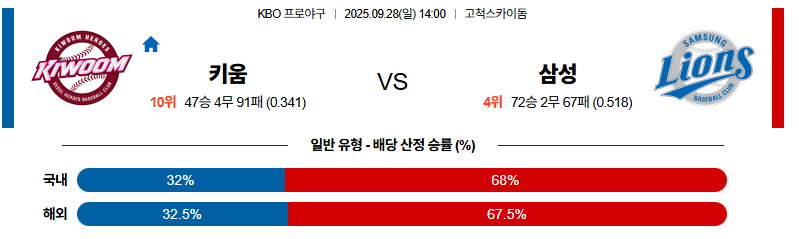 키움은 정현우의 제구 불안과 장타 허용 위험으로 인해 초반 실점 리스크가 크며, 타선의 결정타 부족으로 득점 효율이 낮아 장기전에서 흐름을 되찾기 어려울 것입니다. 반면 삼성은 가라비토가 안정된 구위와 제구로 초반부터 키움 타선을 압박할 수 있으며, 불펜까지 안정감이 높아 리드를 지켜낼 힘이 충분합니다. 따라서 삼성은 초반부터 정현우의 볼카운트 싸움을 흔들어 빠르게 주도권을 잡는다면 경기 전체를 지배할 가능성이 높습니다. 그럼에도 불구하고 키움이 초반 리드를 만들고 불펜이 안정적으로 이어간다면 변수가 될 수 있지만, 현재 전력과 흐름은 삼성이 훨씬 우세합니다.