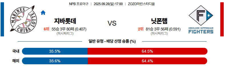 지바롯데 대 니혼햄 NPB 09월28일 맞대결 생중계, 스포츠중계, 스포츠분석