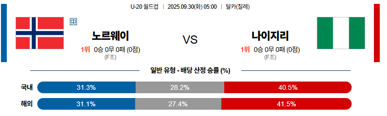 나이지리아는 피지컬과 운동 능력에서 압도적인 우위를 바탕으로 초반부터 강력한 압박과 빠른 속도전으로 노르웨이를 흔들 수 있습니다. 노르웨이는 안정적 빌드업과 조직력을 갖췄지만, 피지컬 열세와 전방 압박 대응 한계가 드러날 수 있습니다. 이번 경기는 전통적으로 연령별 대회에서 강했던 아프리카 팀의 힘과 개인 기량을 앞세운 나이지리아가 승리를 가져갈 가능성이 크다고 생각합니다.